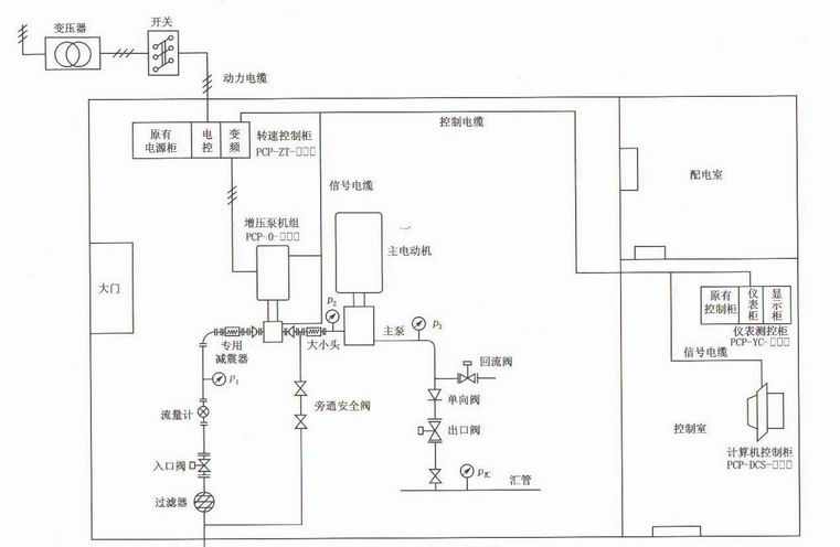 如果是對舊泵站進行PCP改造,可以保留原注水泵入口閥門及管線,在注水泵入口處上接入增壓泵調控系統,見圖6-26,該圖是典型的平面布置圖。