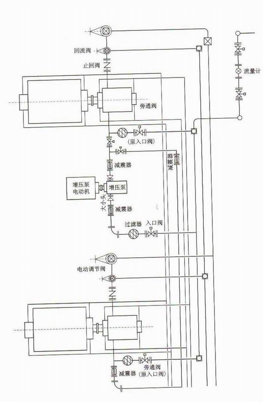 一般工藝流程:由泵站儲水罐來水,經過過濾器入口閥、流量計管線、入口減震器(專利產品)、大小頭)、前置增壓泵、大小頭、減震器(專利產品)、管線、閥(有時無)、管線進入注水泵入口,經注水泵及其出口、單位向閥、出口閥、經管線進入匯管。