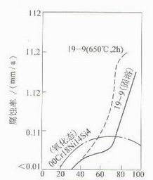 圖2-1是00Cr19Ni11、圖2-2是00Cr18Ni4Si4不銹鋼在硝酸中的腐蝕數據曲線。在硝酸中,含鉬的奧氏體不銹鋼是不耐蝕的,尤其在沸騰的硝酸中更是如此,因此,含鉬的奧氏體不銹鋼通常不在硝酸中使用。