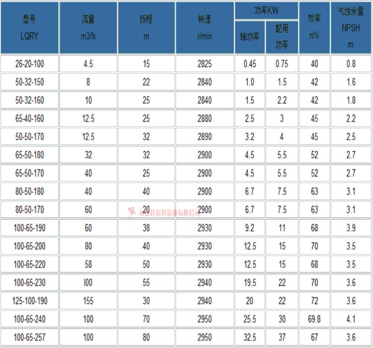【LQRY型熱油泵(導(dǎo)熱油泵)】性能參數(shù):