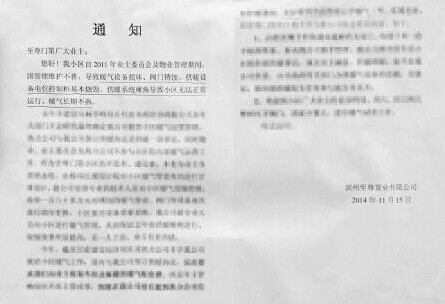 15日,記者來到位于黃河二路渤海十六路的門第小區,小區內的一座高層居民樓里的電梯已經斷電停止運行,有水正順著電梯從樓道里流出。樓前圍著幾個居民,正在看剛貼在樓道口的通知。通知上稱,小區由于業主委員會及物業管理維護不善,暖氣設備損壞,閥門銹蝕、供暖設備電位控制柜基本燒毀,供暖系統癱瘓,小區暖氣長期不熱。